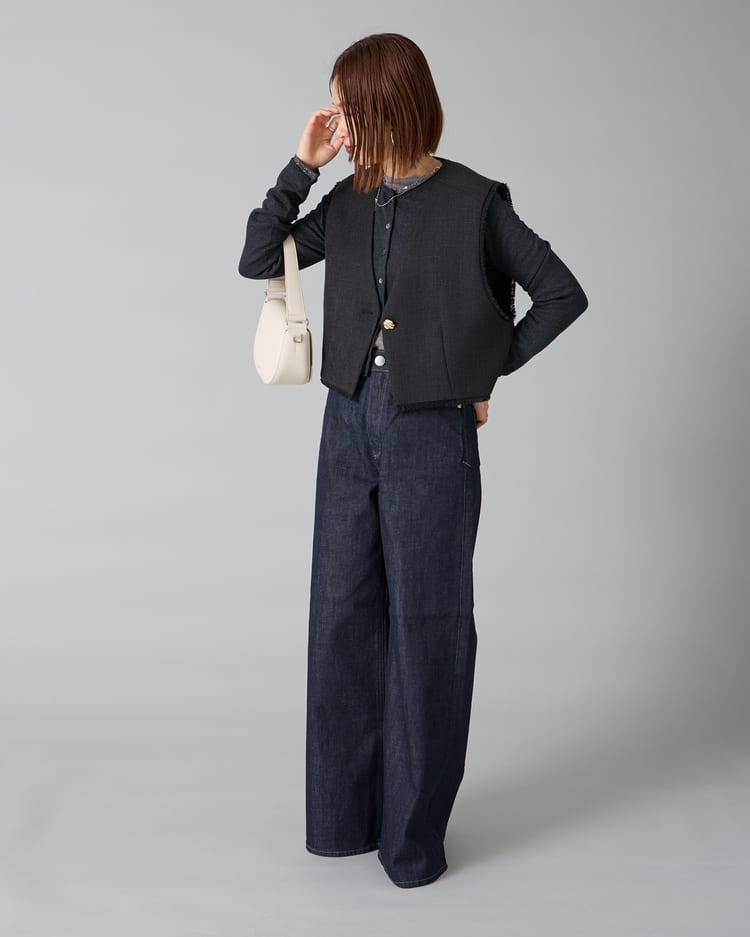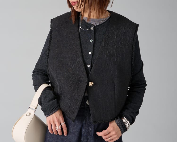 裾のフリンジがシンプル服にちょうどいいアクセントに。華やかだけど盛りすぎないので、普段はカジュアル派の人にも取り入れやすいデザイン。白シャツ×デニムに重ねれば写真のようにオフィス見えも◎。他にも、ロゴT×スラックスで大人の休日バランス、オールブラックでモードにも、タイトスカート×ベストでセレモニー寄せにもOK。
