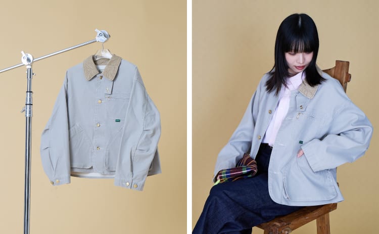 襟の切り替えや、ワークなポケットの配置、ゴールドフロントのボタンといった要素がしっかりあるから、トップスはシンプルに大人っぽく合わせたい1着です。