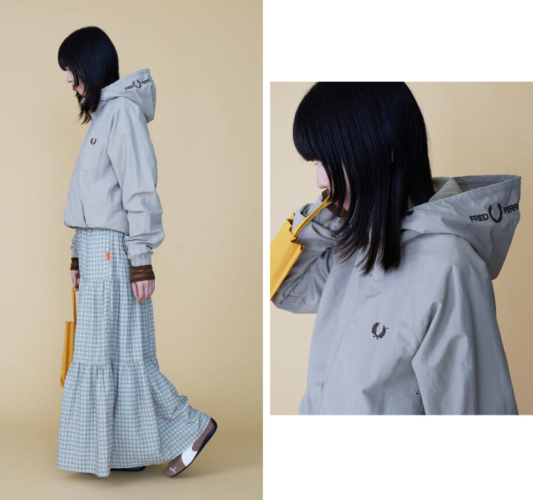 FRED PERRY別注の フード刺繍 ナイロンパーカーは、スポーティ過ぎない上品さが魅力。程よくゆとりのあるシルエットで、スウェットやロンTの上から羽織ってももたつきにくく、フードの刺繍ディテールが後ろ姿まできちんとオシャレ見えさせてくれます。