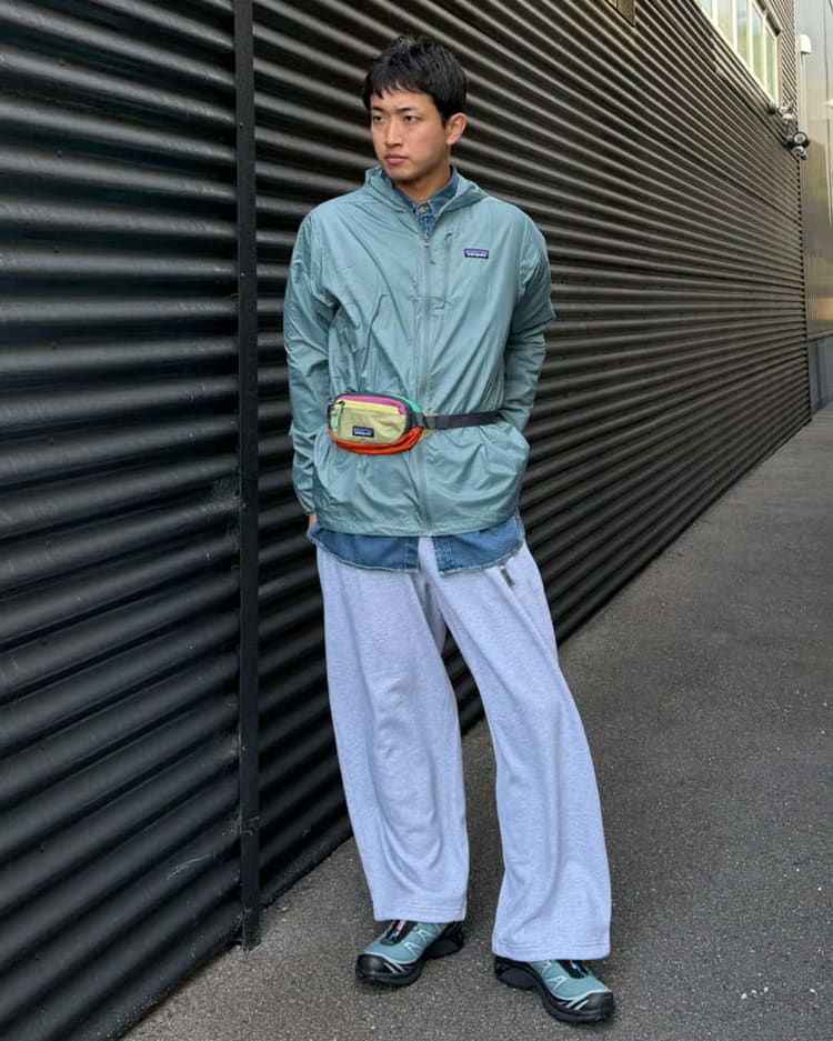 松山店 山下さんのスタッフスタイリングフーディニジャケットを主役にした、軽やかなアウトドアミックススタイル。