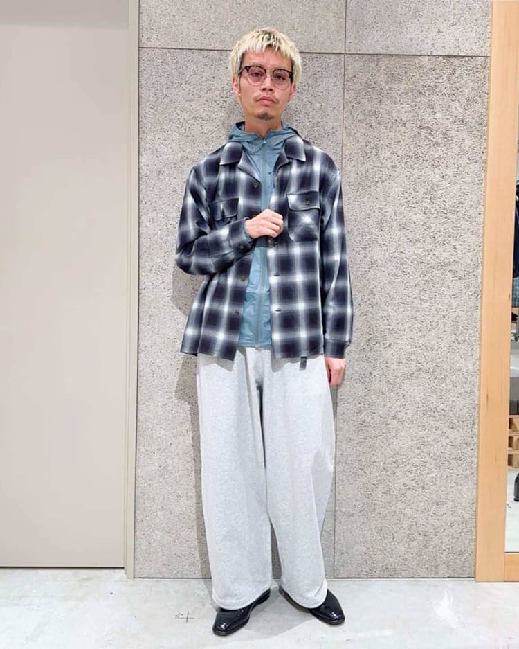 シャツをインナーに重ねることで奥行きを出しつつ、ゆったりとしたスウェットパンツでリラックス感のあるシルエットに。