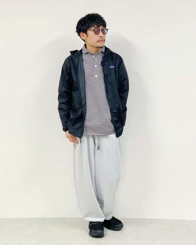 卸団地本店 西笛さんのスタッフスタイリングパタゴニアのフーディニジャケットに、細かなチェック柄のシャツを合わせたレイヤードスタイル。
