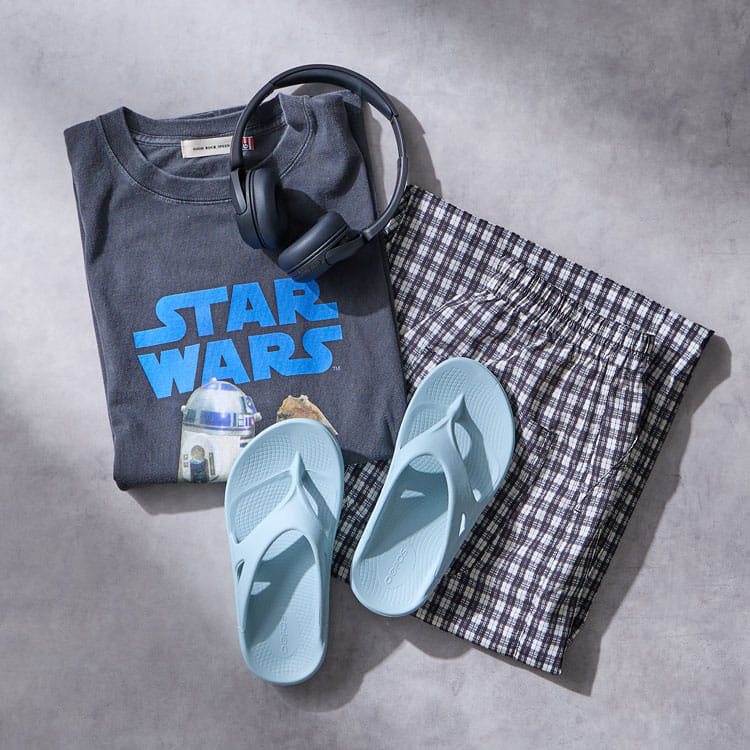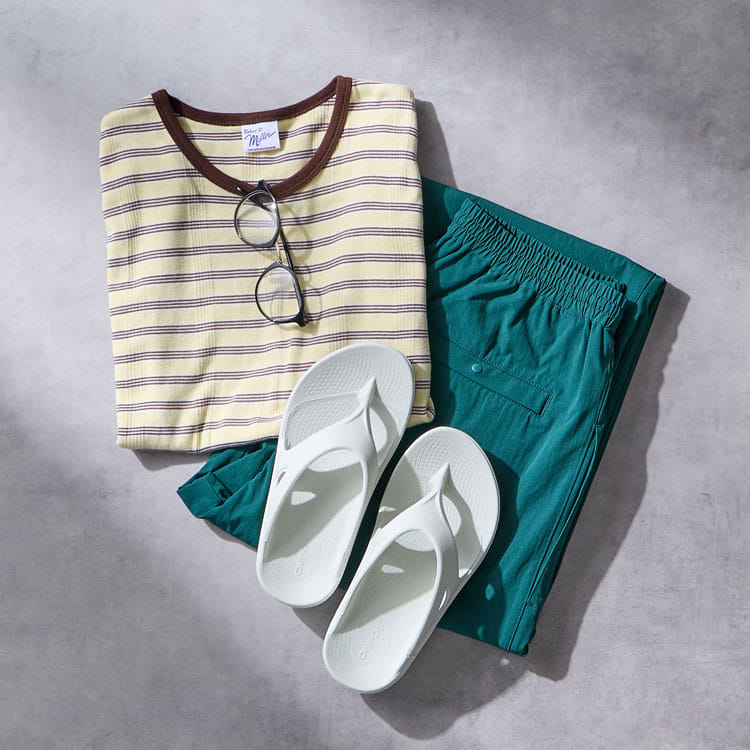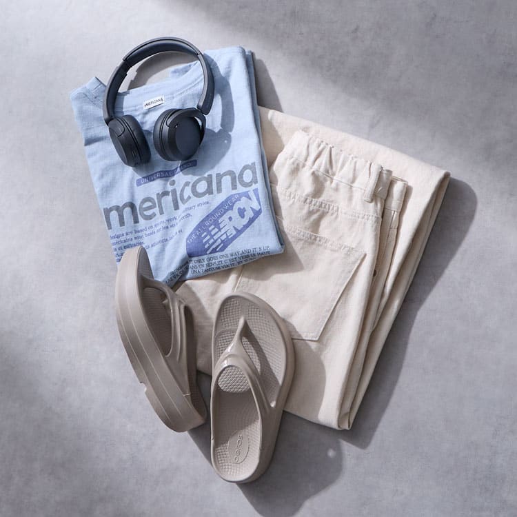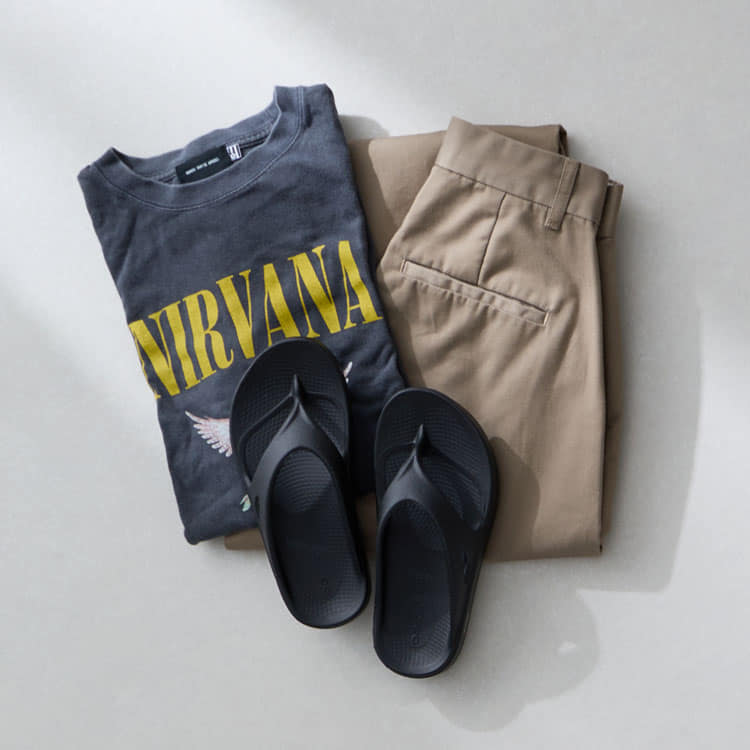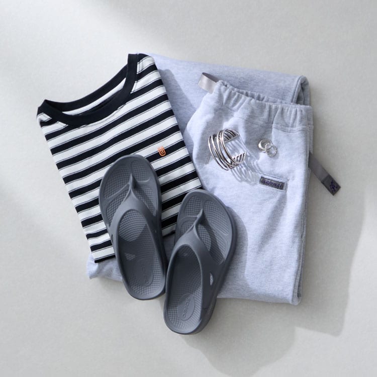 オンラインショップ:氏原さんのスタイリングOOFOSを主役にするコツは、“頑張りすぎない”のに“だらしなく見せない”こと。作りこんだスタイリングの日は、足元をOOoriginalで抜いてこなれたバランスに。