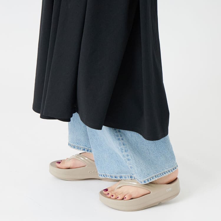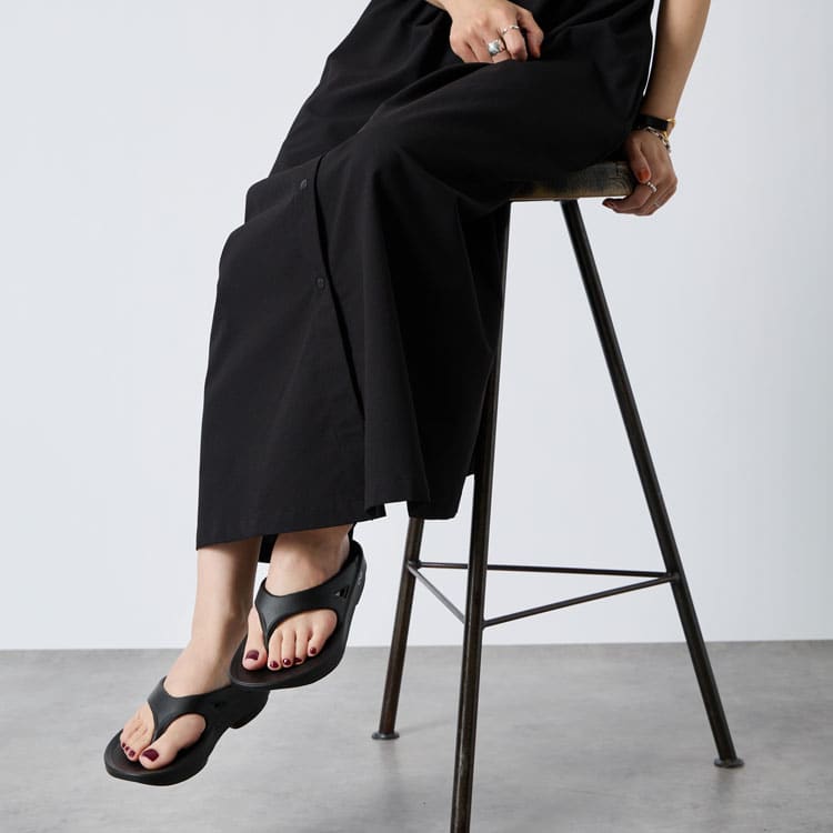 指先がすっと見えるVラインの抜け感があるから、同じリカバリーサンダルでもどこか都会的で、ワンマイルだけで終わらないのが魅力です。ふわっと沈んで、OOFOSならではのクッション性はそのままに、鼻緒タイプ特有のホールド感で歩行も安定。
