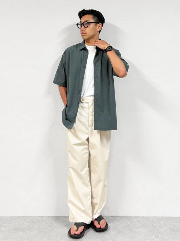 岡山店:松原さんのスタイリングホワイト+グレーのキレイめなトーンにOOFOSで抜け感を出す、大人のサマーコーディネート。サンダルなのにカジュアル過ぎない絶妙なバランスに。
