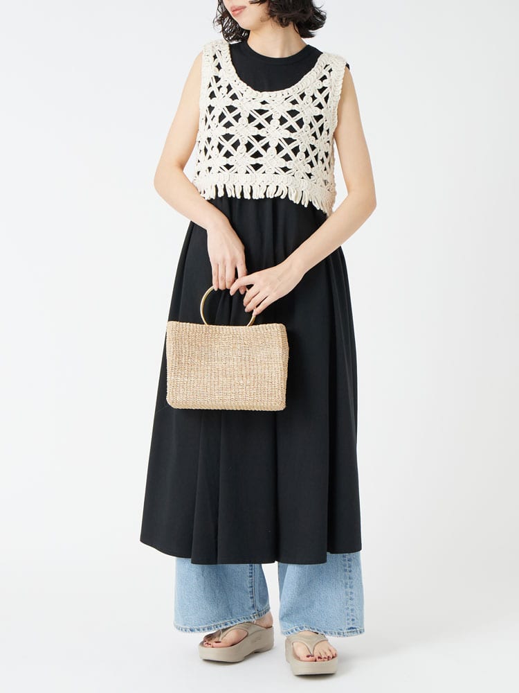 ブラックのワンピースを主役にしながら、足元はOOmegaで“抜け”と“今っぽさ”を足し算した、都会派リラクシーの好バランス。