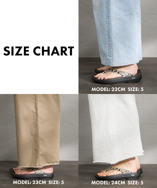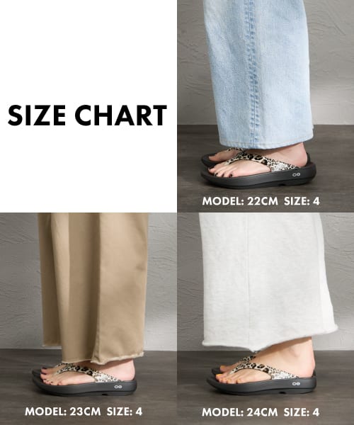 OOlala(ウーララ)は、OOFOSの中でも“トング=鼻緒”のフィット感が特徴的なモデル。“前滑りしにくい”ぶん、ジャストを選ぶとホールド感がしっかり出ます。画像のように、US4/US5を履き比べると、見た目の印象が一気に変わるのがポイント。