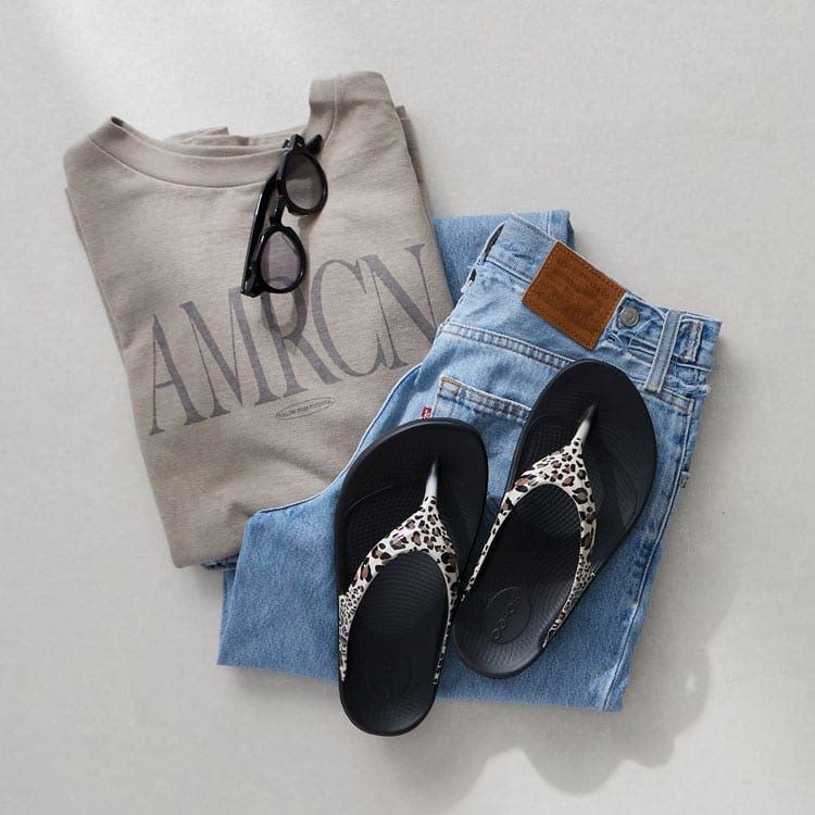 OOFOSはブラックが一番人気カラー。Tシャツ×デニムのワンマイルから、シャツやワンピのきれいめコーデまで、足元だけ浮かずにすっと馴染みます。黒なら輪郭が引き締まって大人っぽく見えるのが強み。さらに、肌見せが増える季節でも色のコントラストで脚元がすっきり見えやすく、コーデ全体のバランスが取りやすいのも支持されるポイントです。
