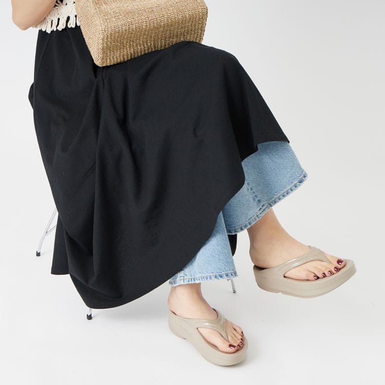 OOFOS特有のふわっと吸い付くようなクッション性はそのままに、ソールに高さを持たせることで“盛れるのに疲れにくい”を実現してくれます。視線が自然と上に上がる分、脚がすらっと長く見えて、ワイドパンツやロングスカートの日でも重心が下がりすぎないのがポイント。