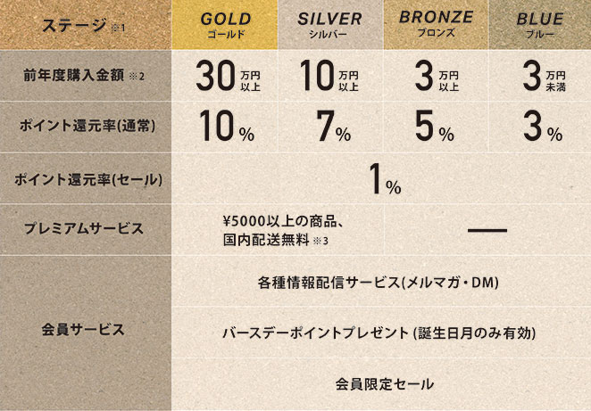 JEANS FACTORY FRIENDSポイントサービスでは、年間の購入金額(税抜)に応じて翌年度の会員ステージが変わります。