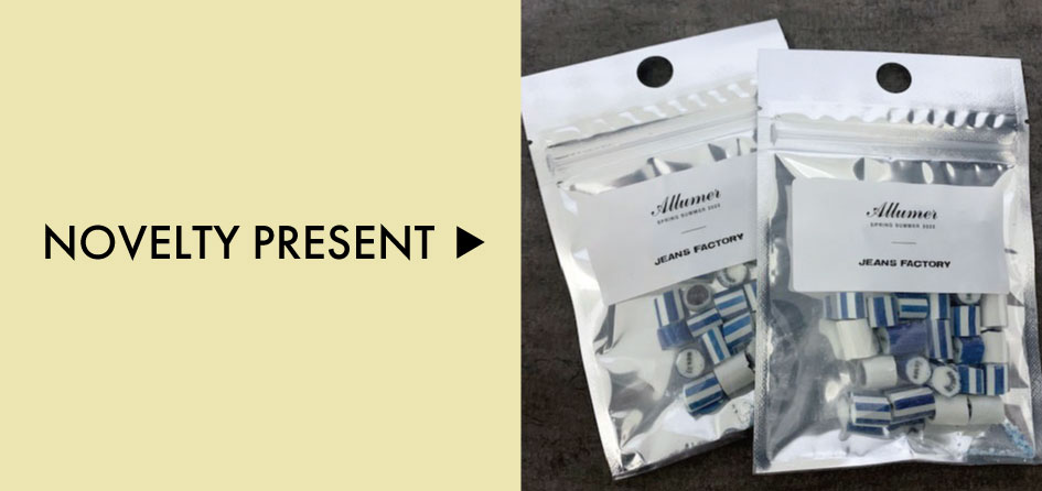 開催店舗ではALLUMERをご購入いただきました方へ先着順に「ALLUMER×JEANS FACTORY」のオリジナル金太郎飴をプレゼント。※なくなり次第終了いたします