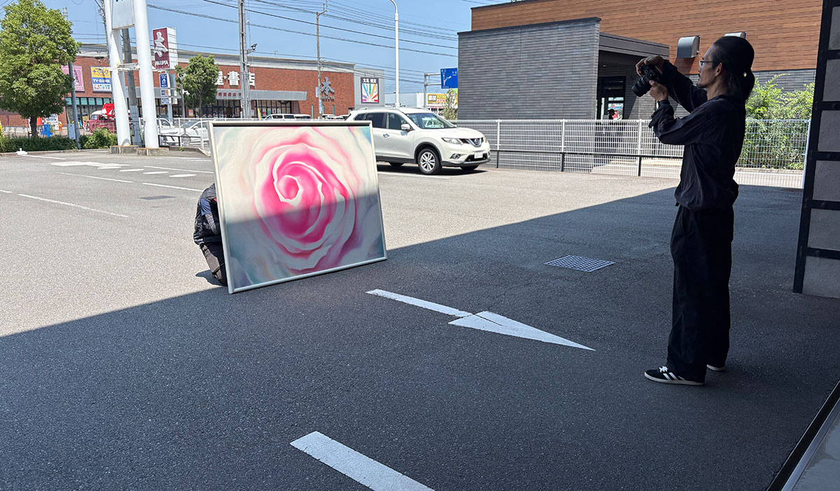 撮影は夏が始まる6月下旬からスタート。ジーンズファクトリー松山店に数多く設置しており、大きな作品を地上に下ろして撮影しました。
