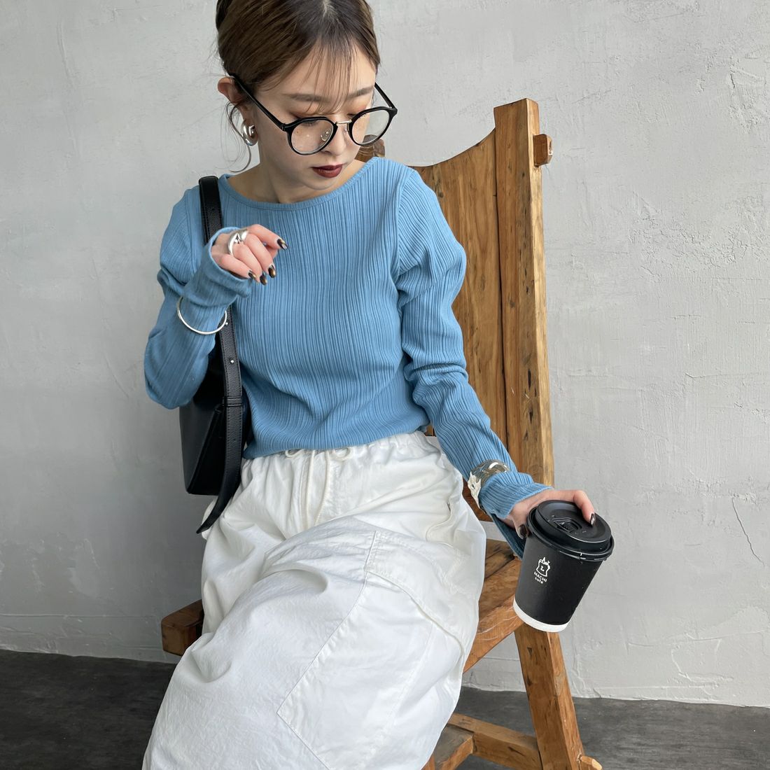 トップス : タイトすぎないフィット感。袖口、裾にスリットあり。凹凸のある素材。ネック広め。
