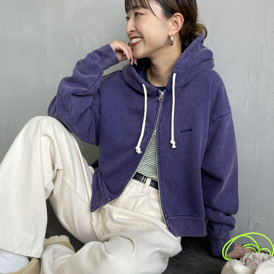 ジップパーカーで抜け感を出しつつ、赤スニーカーがコーデの差し色に🌟