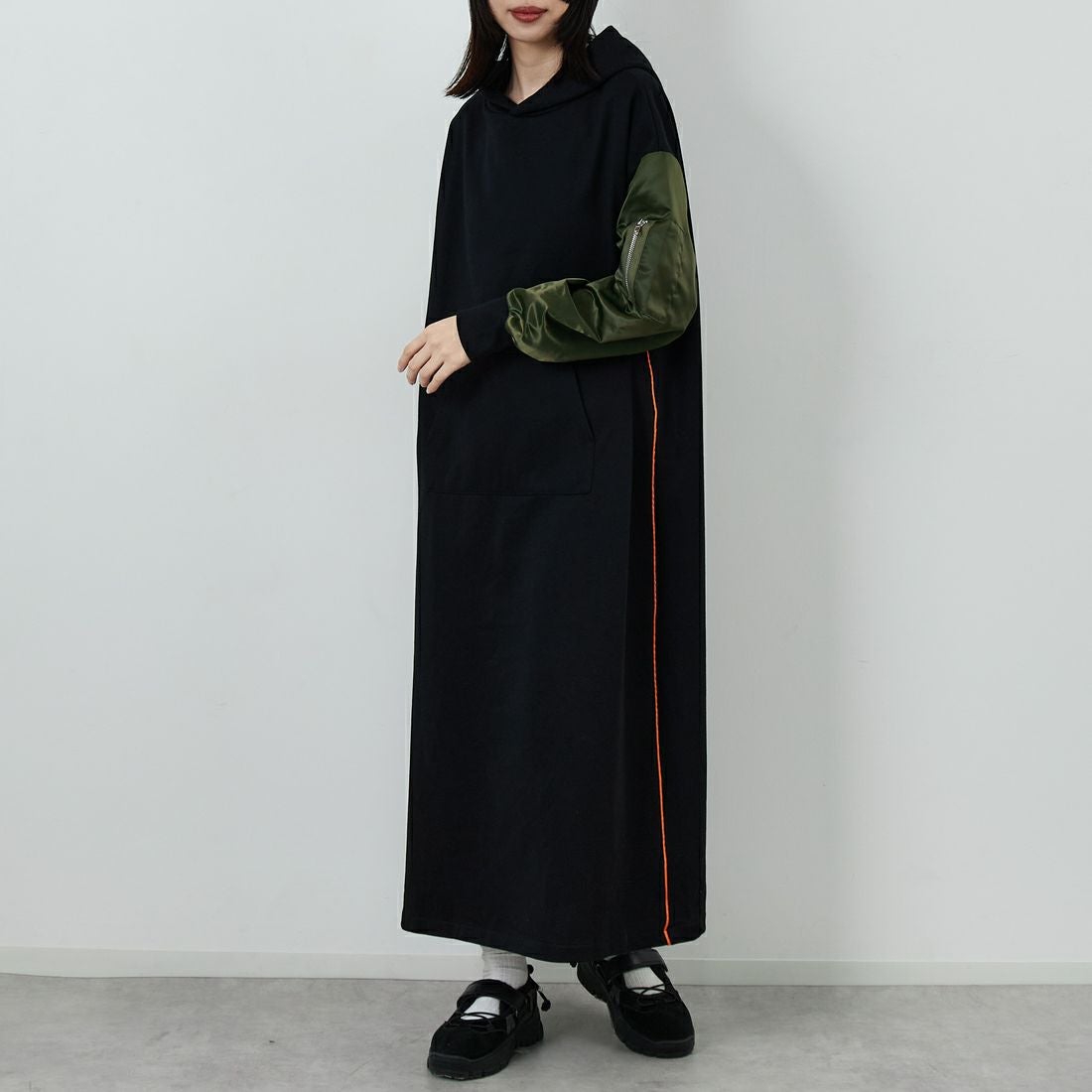 jfreadymadeのワンピースは、異素材で切り替えが目を引くフードワンピース。