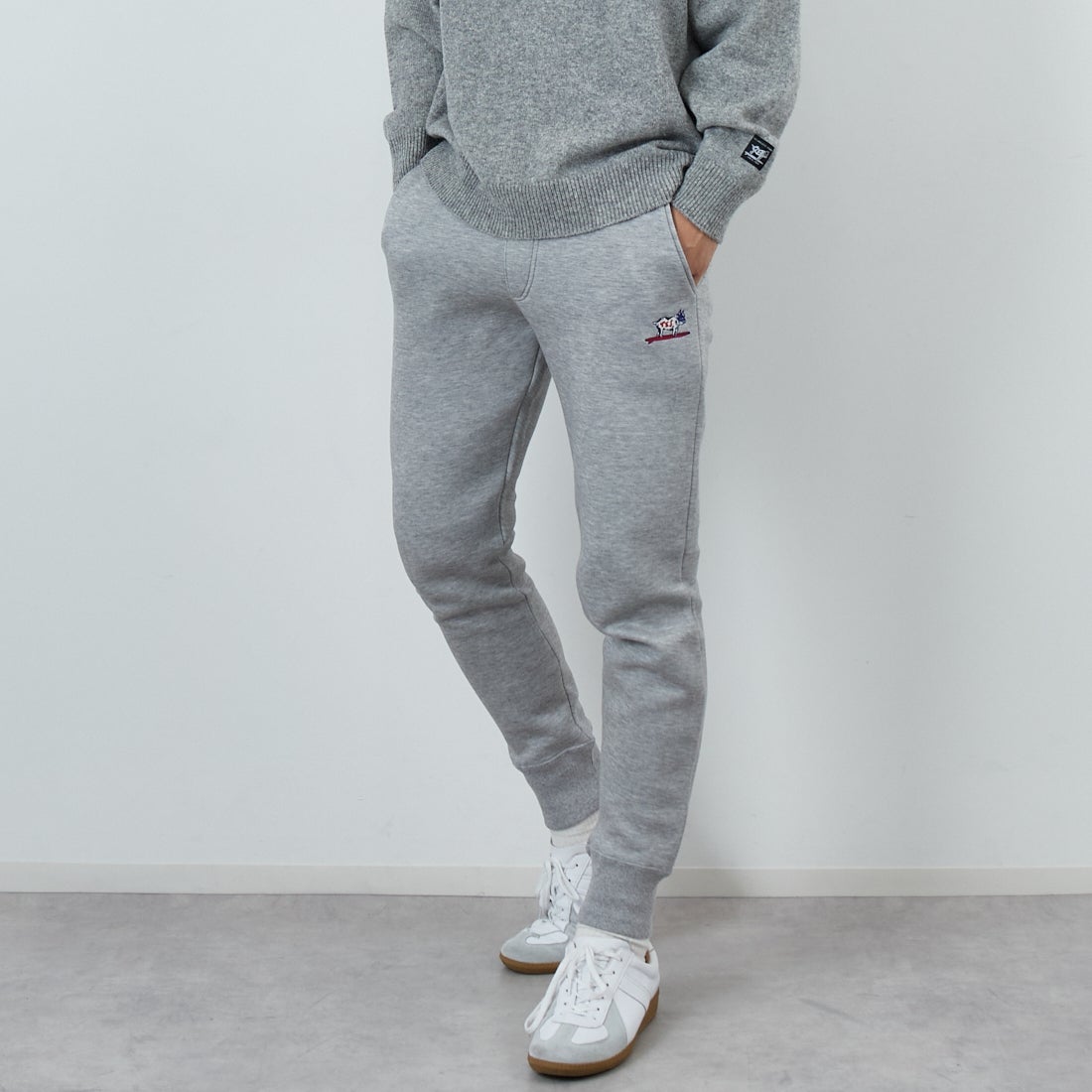 スウェットパンツ : すっきりとしたテーパードシルエットながら、程よくハリと伸縮性のある生地感で穿きやすいアイテム。サイズ感ベーシック。