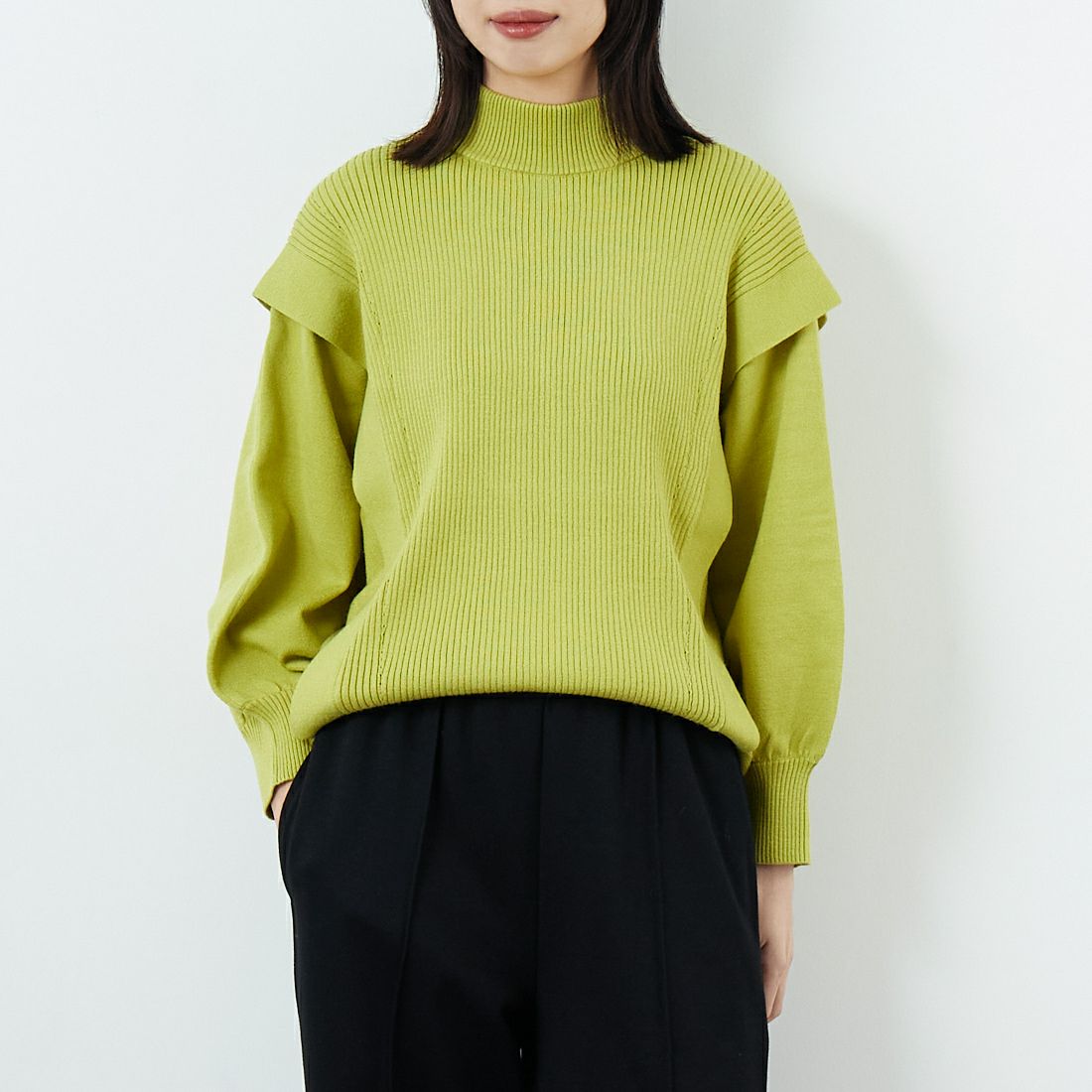 明るいライムイエローのニットを主役にスタイリング🍋