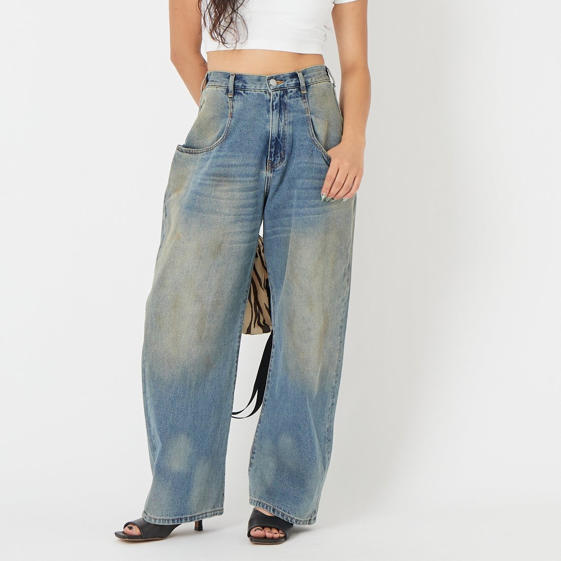 デニムは大きいポケットが特徴で、カーブしたデザインです。サイズはSを着用。