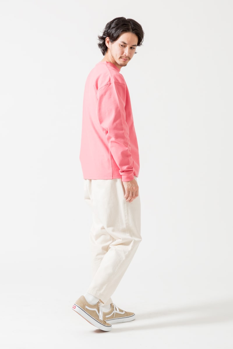 インナーに挿したピンクカラーで効果的なアクセントを加えたシンプル&クリーンなシャツスタイル。大人っぽさのある柔らかな配色がこなれ感を演出し、いつもの日常着をスタイルアップ。ジャストレングスのパンツにスニーカーと無駄なくまとめた潔さも好印象。