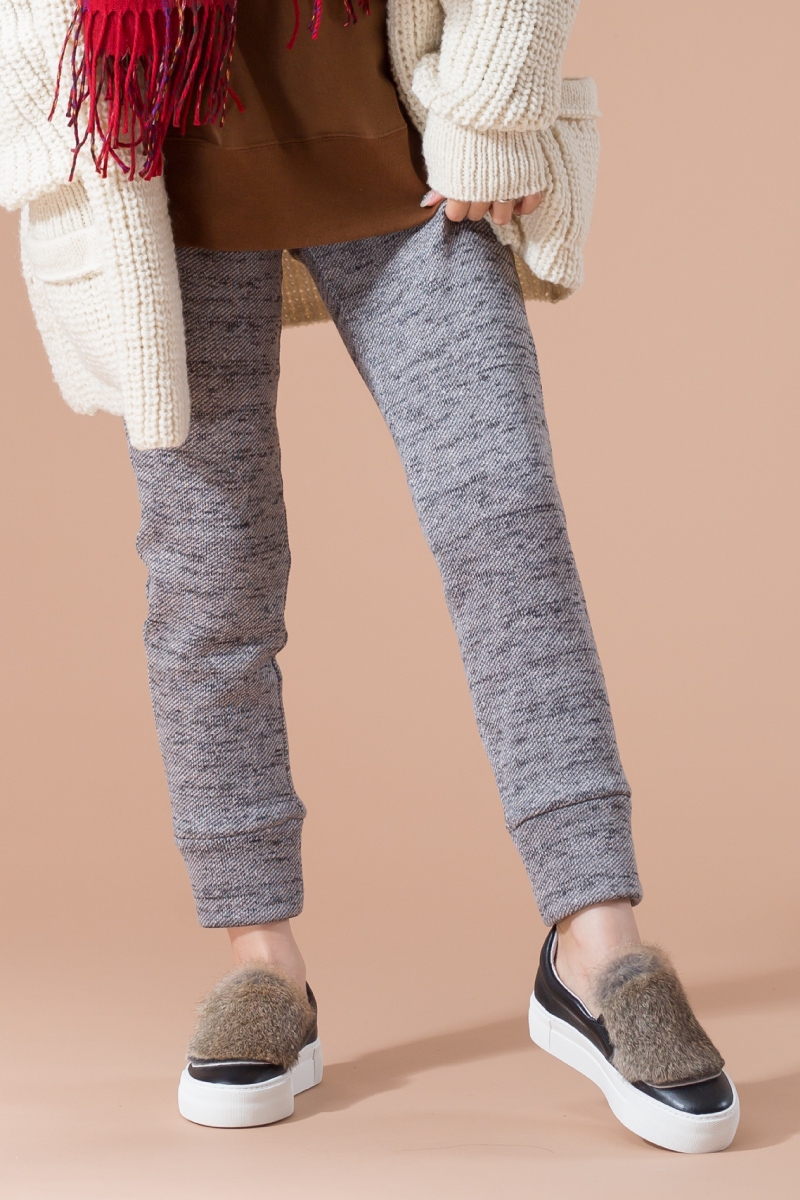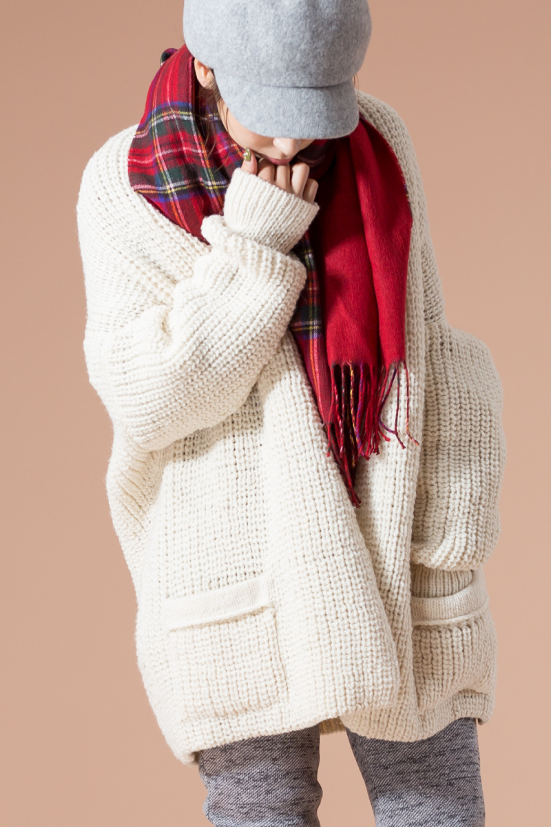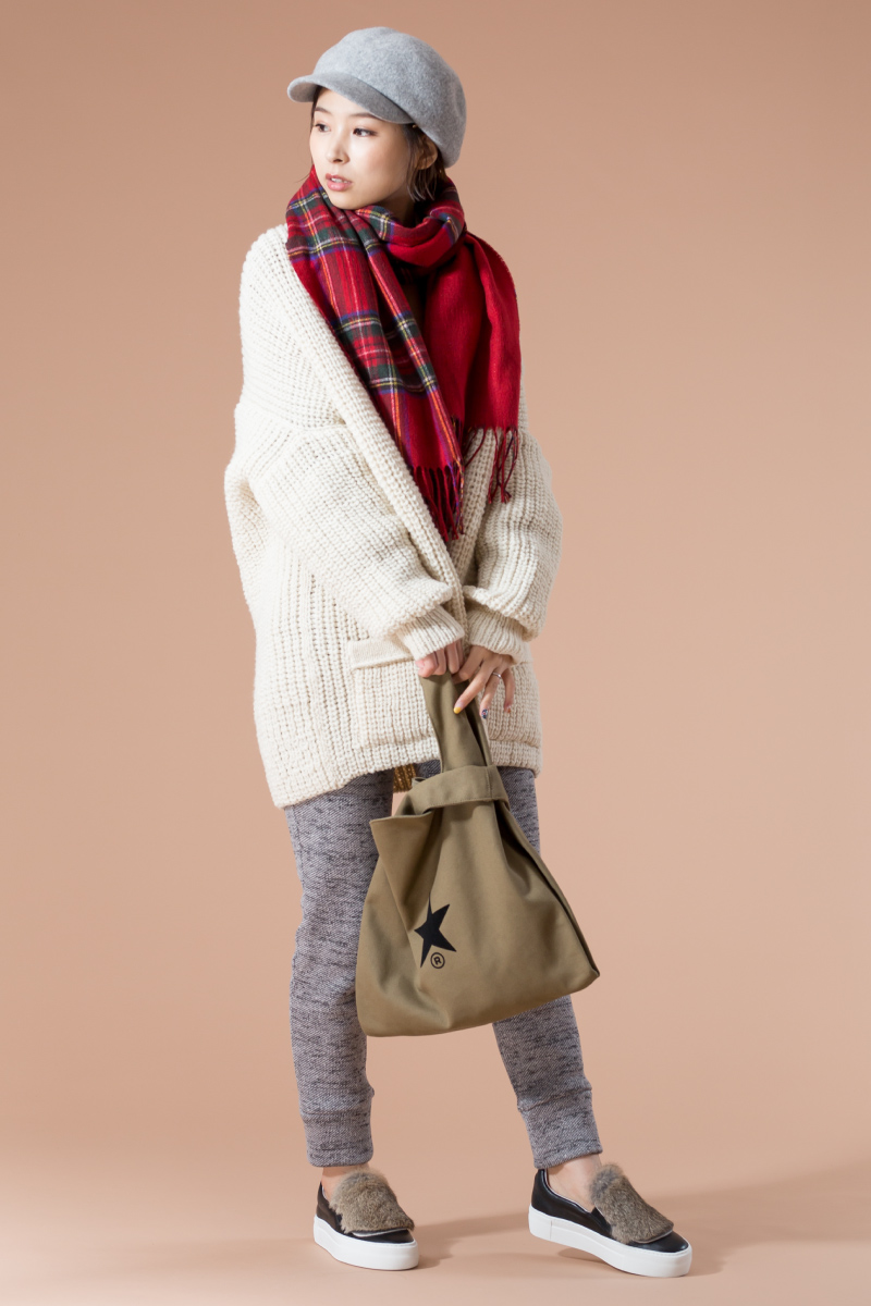 ざっくりニットは肩を落として着ると、スウェット×フリースパンツのリラックススタイルをこなれた印象に仕上げてくれる。チェック柄のストールを軽く巻いて、大人可愛いをプラス。