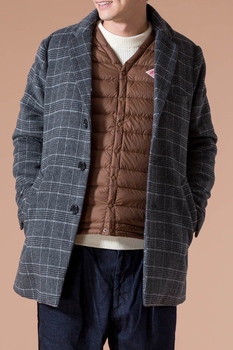 クラシカルな印象のチェック柄コートには、程よくルーズなラインパンツで遊び心ある着こなしを。着丈が短めのコートなのでカジュアルに、またニット×ダウンベストのレイヤードもしっくりと着こなせる。
