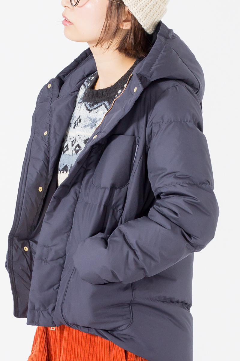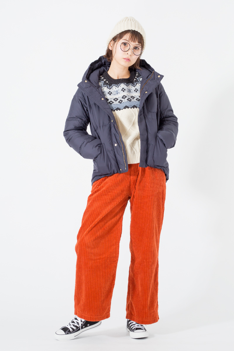 冬の最強アウター・ダウンジャケットもショート丈デザインなら少し肩を落とし気味に着ると、抜け感のある着こなしに。ニット×ボトムの組み合わせは、チョイスするカラーや柄でクラシカルさを演出できる。